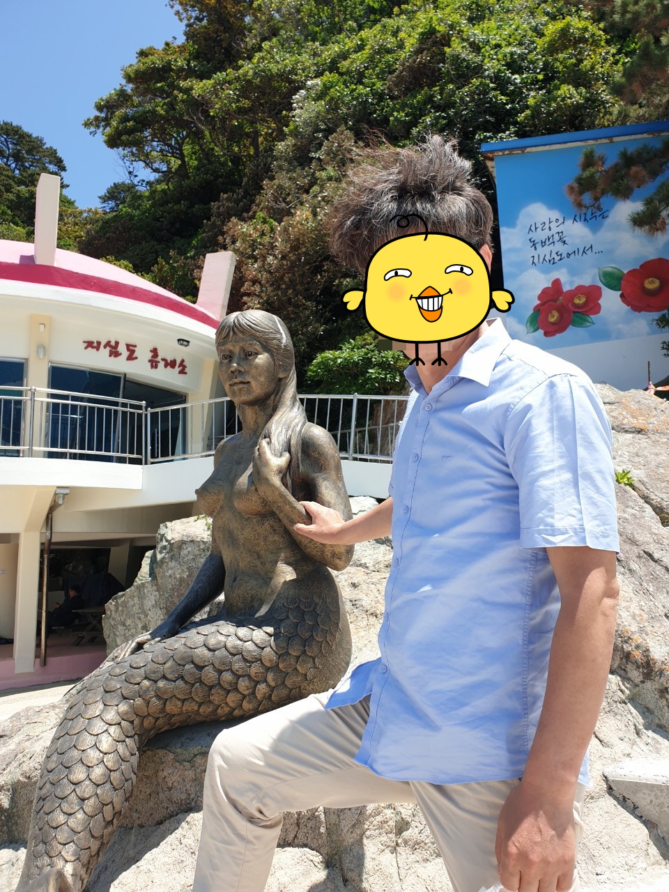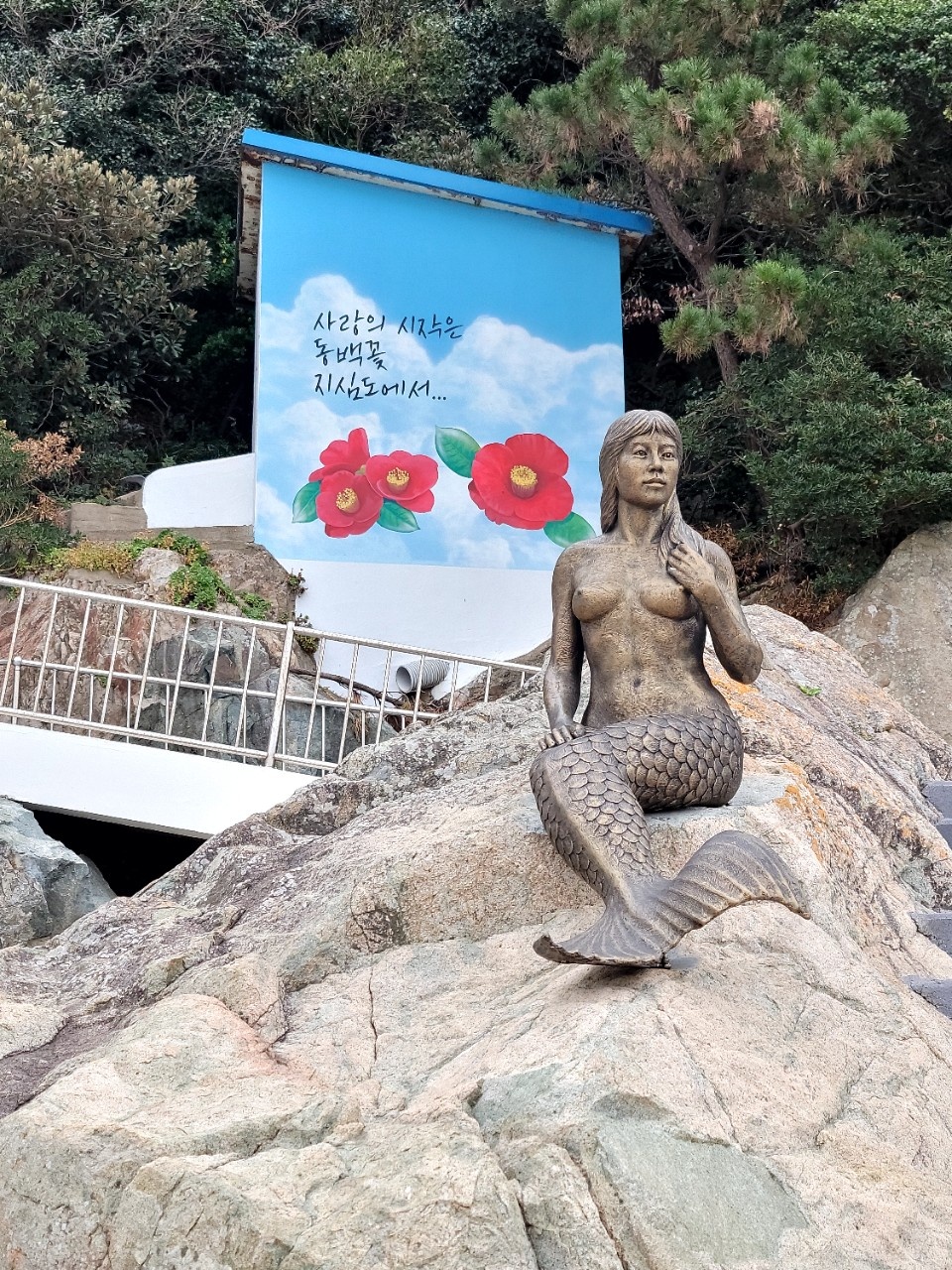 지심도 선착장에 도착하면 휴게소 건물이 보이고 거기엔 커다란 인어상이 반긴다. 그리고 그 선착장 옆으로는 동백꽃이 그려진 그림계단이 있어 그 주변에서 낚시꾼들이 물고기를 잡으려 낚시줄을 드리우고 있는 풍경을 마주하게 된다.