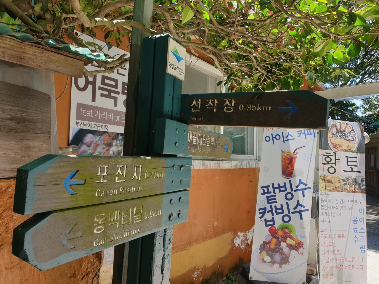그렇게 '해안선 전망대'와 '그대발길 돌리는 곳'이라는 막대른 곳에서 발길을 돌려 전등소사택 방향으로 뒤돌아 나와서 그간 걸어온 만큼 한참 걷다 보면 처음에 봤던 갈림길 이정표가 보일 것인데, 선착장 방향으로 언덕길을 내려가 선착장 휴게소로 가면 된다. 하지만 2022년 5월 따뜻한 봄날 지인과 함께 했을때는 그냥 내려가지 않고 중턱에 있는 식당에서 회 한 접시에 술을 곁들이면서 지심도에서 장승포 항구까지의 바다를 조망하는 여운을 더 가졌었다.