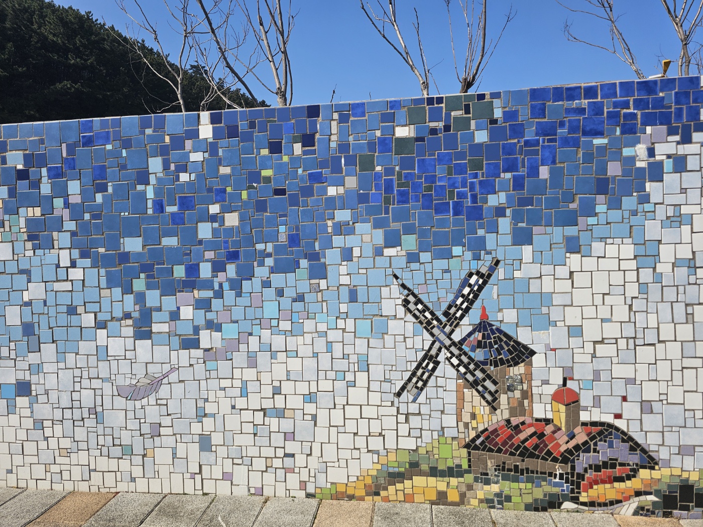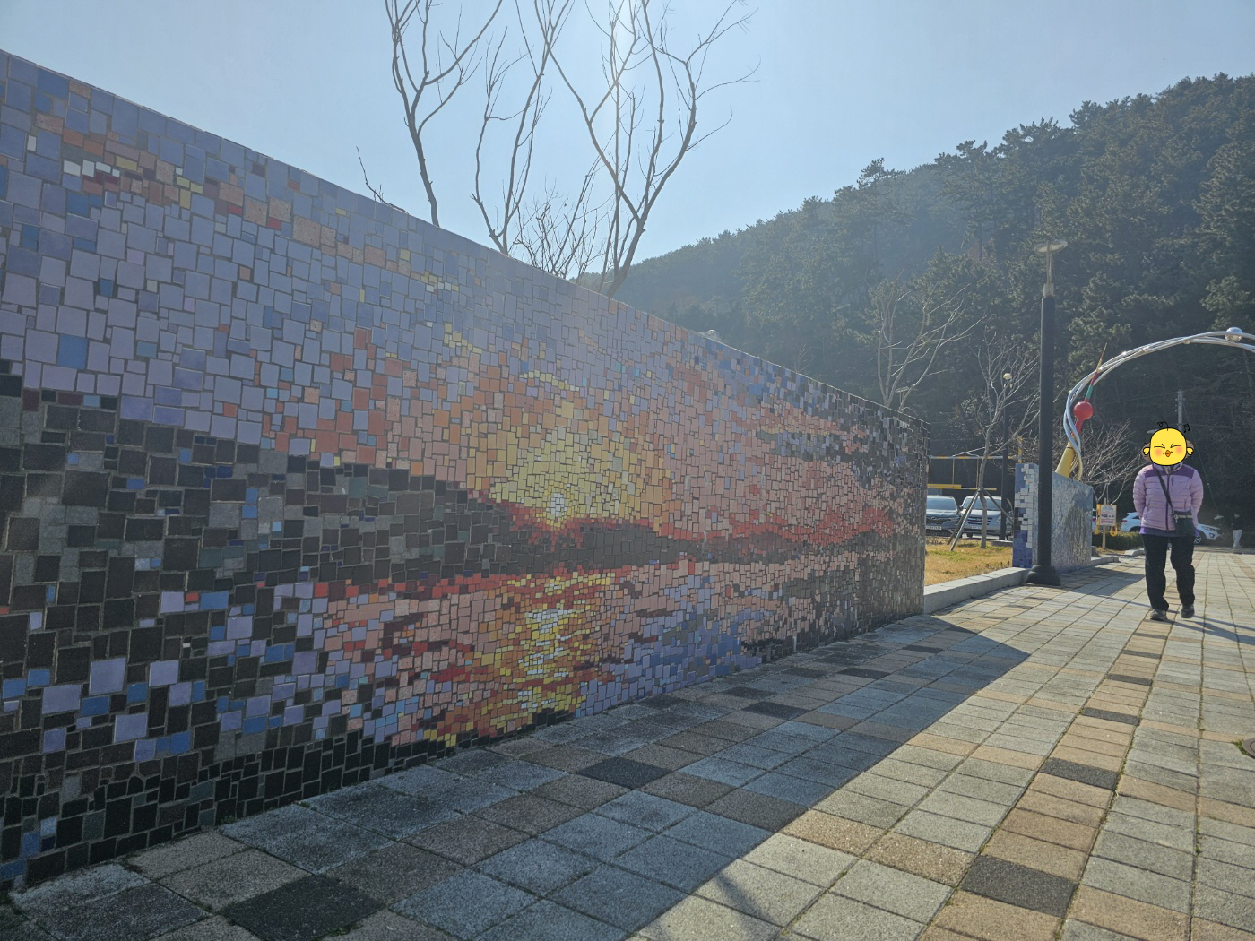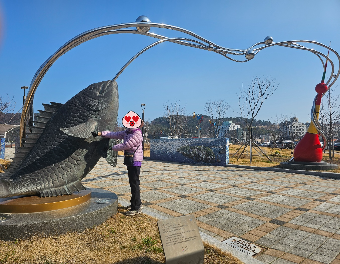 능포수변공원 입구에 있는 물고기 조각 작품 주변으로 타일 같은 돌들 붙여서 만든 벽화들이 많았는데 그걸 감상하며 공원 가운데 나무데크 광장으로 가다보면 갈매기에게 새우깡을 주는 모습을 조각한 커다란 작품이 나온다. 정말 이곳은 놓칠수 없는 사진 포인트라 할 것이다.