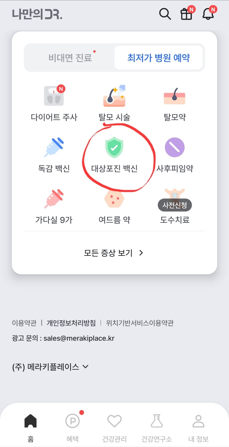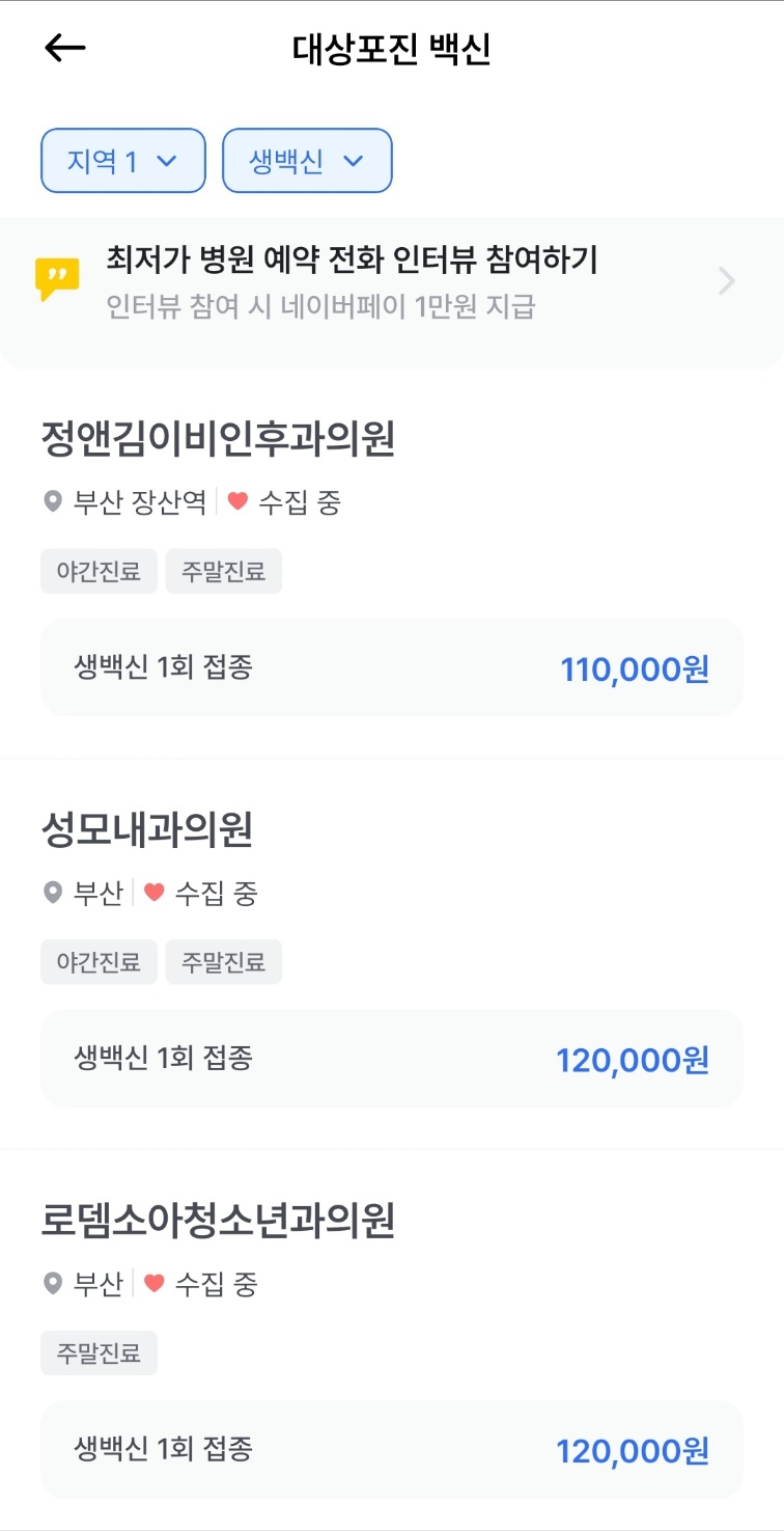 그래서 대상포진 예방접종 비용을 알아보려 검색해보니 '나만의 닥터'라는 앱을 알게 되었는데, 이 앱을 통해 전국 접종비 평균가격 및 위와 같이 해당지역 최저가 병원을 조회할 수 있어서 좋았다. 부산 해운대구 지역을 선택하고 1회만 접종하고 접종료가 저렴한 생백신으로 좁혔더니 정앤김 이비인후과 의원이 조회되었다.