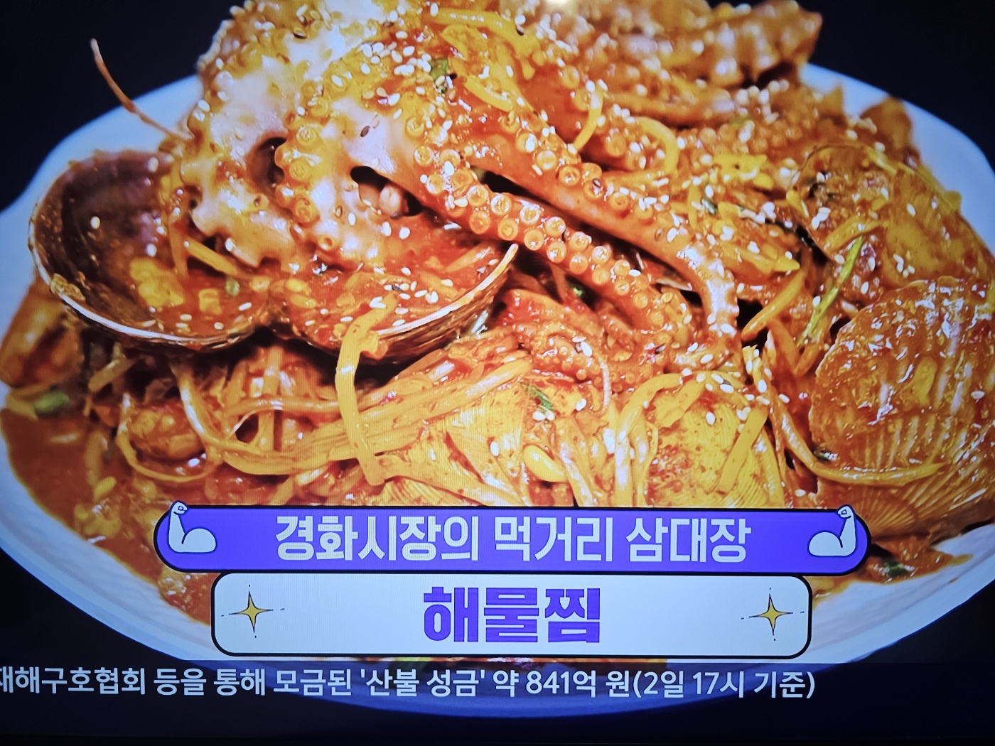 두번째로 소개된 맛대장으로는 3대째 해군출신이라는 사장님의 해물찜이 소개되었는데 커다란 낙지가 각 잡고 나오고, 아몬드와 같은 견과류와 들깨를 넣어 만드시는게 비법이라고 하네요. 해물찜 대자가 55,000원!!!