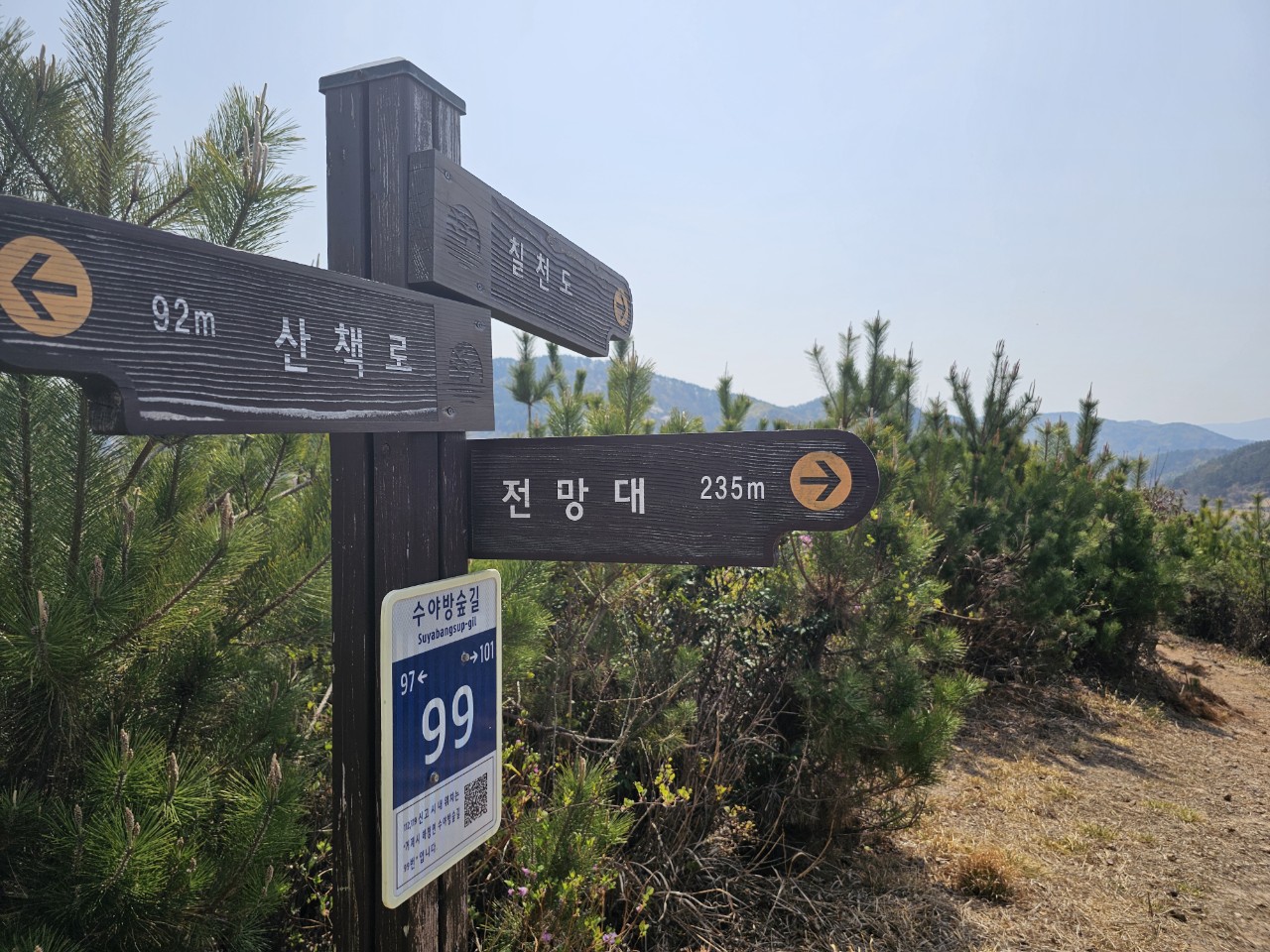 수야방교를 건너 가서 숲길로 들어서 조금만 가면 갈림길이 나오는데 오른쪽 위로 향하는 길은 수야방도 정상에 있는 '정자' 쪽이고, 왼쪽 옆으로 나있는 길은 '전망대' 방향이다. 우린 '전망대'를 먼저 들른 후 '정자'로 오르곤 했다.