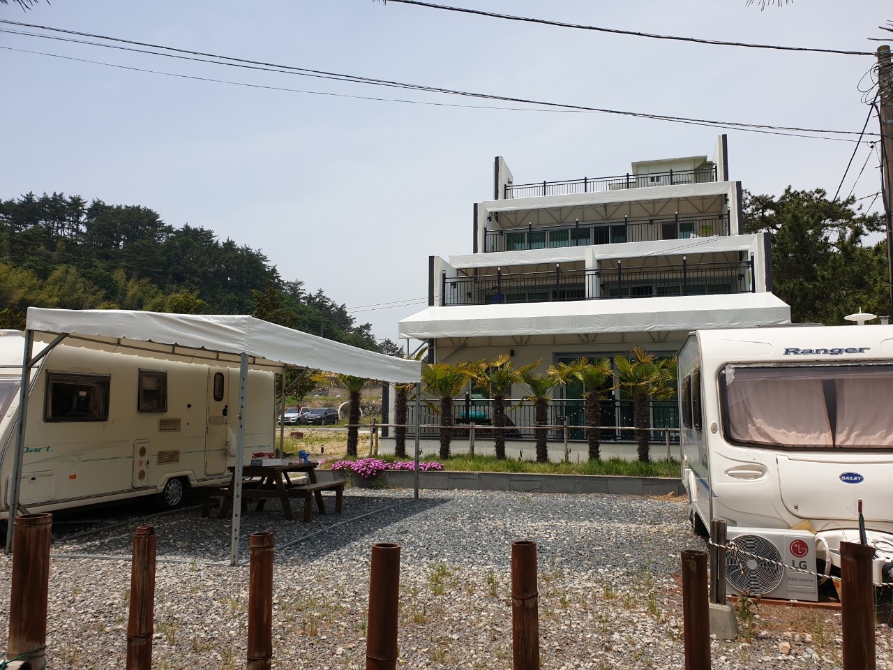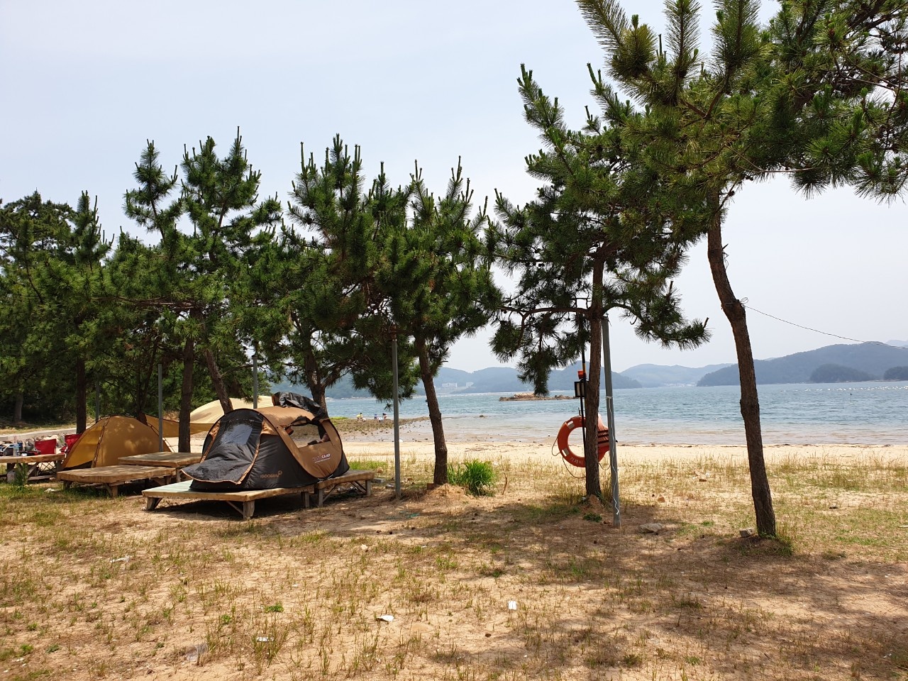 백사장 뒷편에 나무로 된 평상에 텐트를 치거나 더 뒤 쪽에 있는 카라반 또는 펜션을 이용하는 사람도 있다.