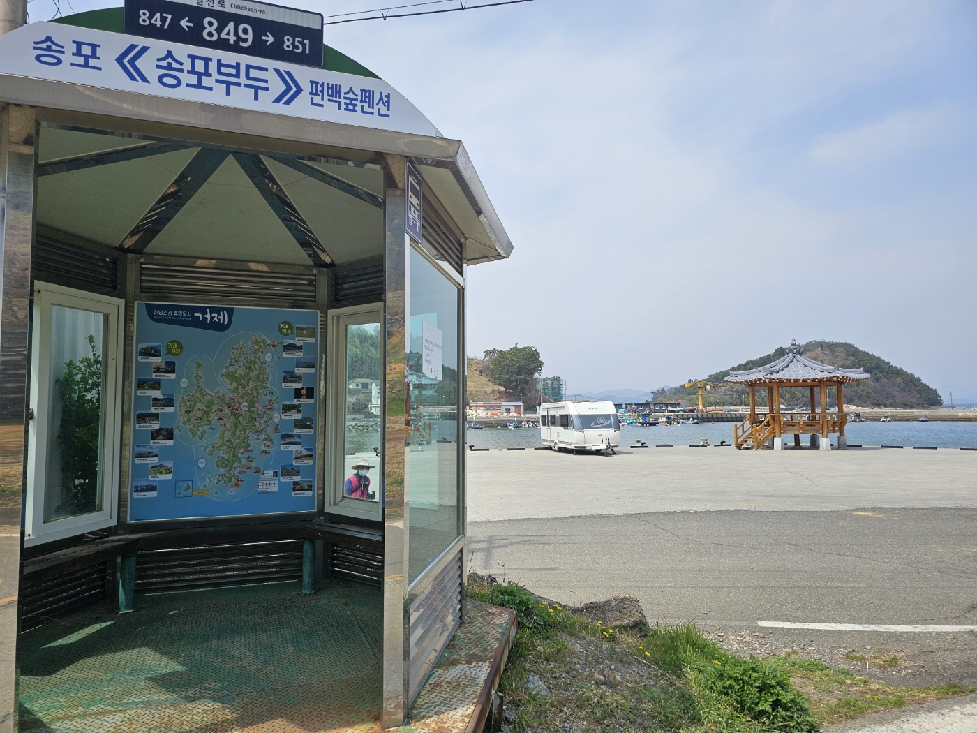 수야방도를 다 둘러 본 후 버스 타고 거제 고현터미널로 되돌아 갈 분은 '송포부두' 정류장에서 타시면 되구요. 처음 여기 버스정류장에서 하차해 수야방도로 걸어 들어가기 전에 고현버스터미널로 돌아갈 것에 대비해서 버스시간표를 미리 살펴본 후 그 시간에 맞게 버스정류장으로 돌아오면 기다리지 않아 좋아요 ^o^
