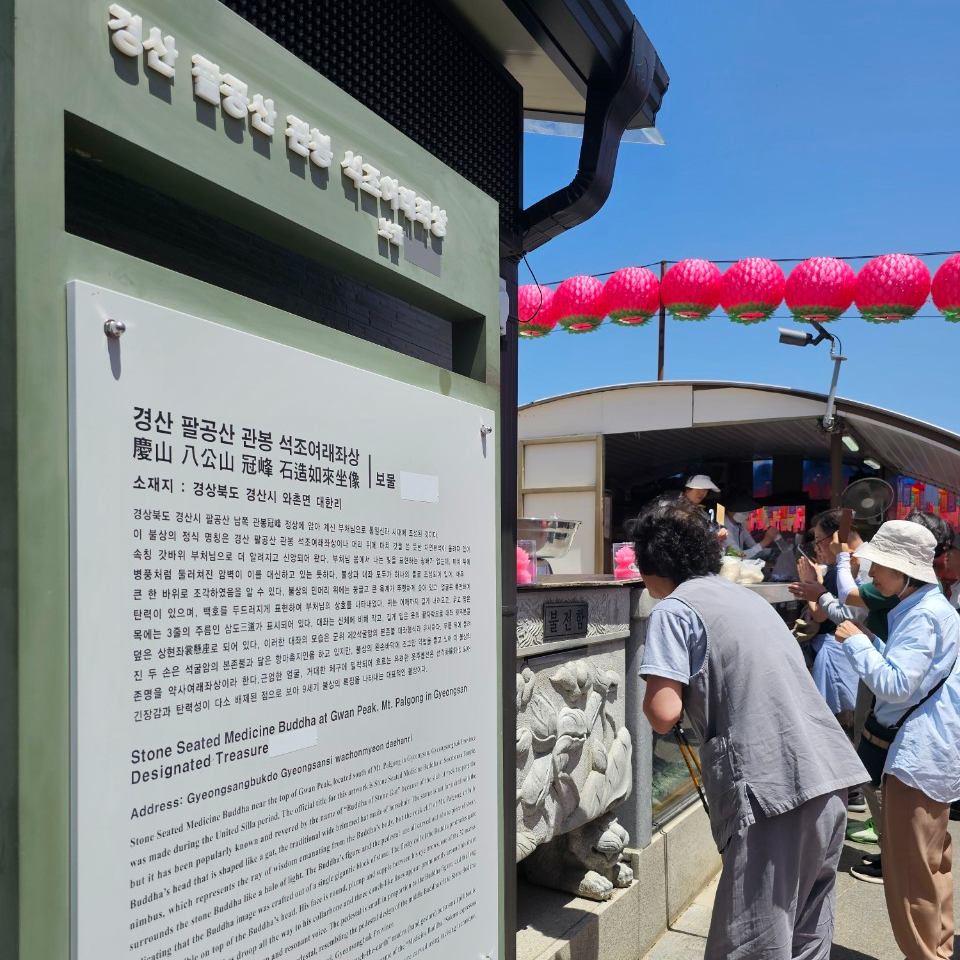 관봉에 오르면 약사여래불을 반복하는 염불소리가 낭낭하게 들리는데, 약사여래불이란 질병을 치료하고 재앙에서 구원해 주는 부처님을 말한다. 관봉석조여래좌상(갓바위 부처님)은 해발 850m 정상에 근엄한 표정으로 항마촉지인으로 정좌하고 있는데 하나의 소원은 들어준다는 소문 때문인지 기도하는 사람으로 붐빈다.