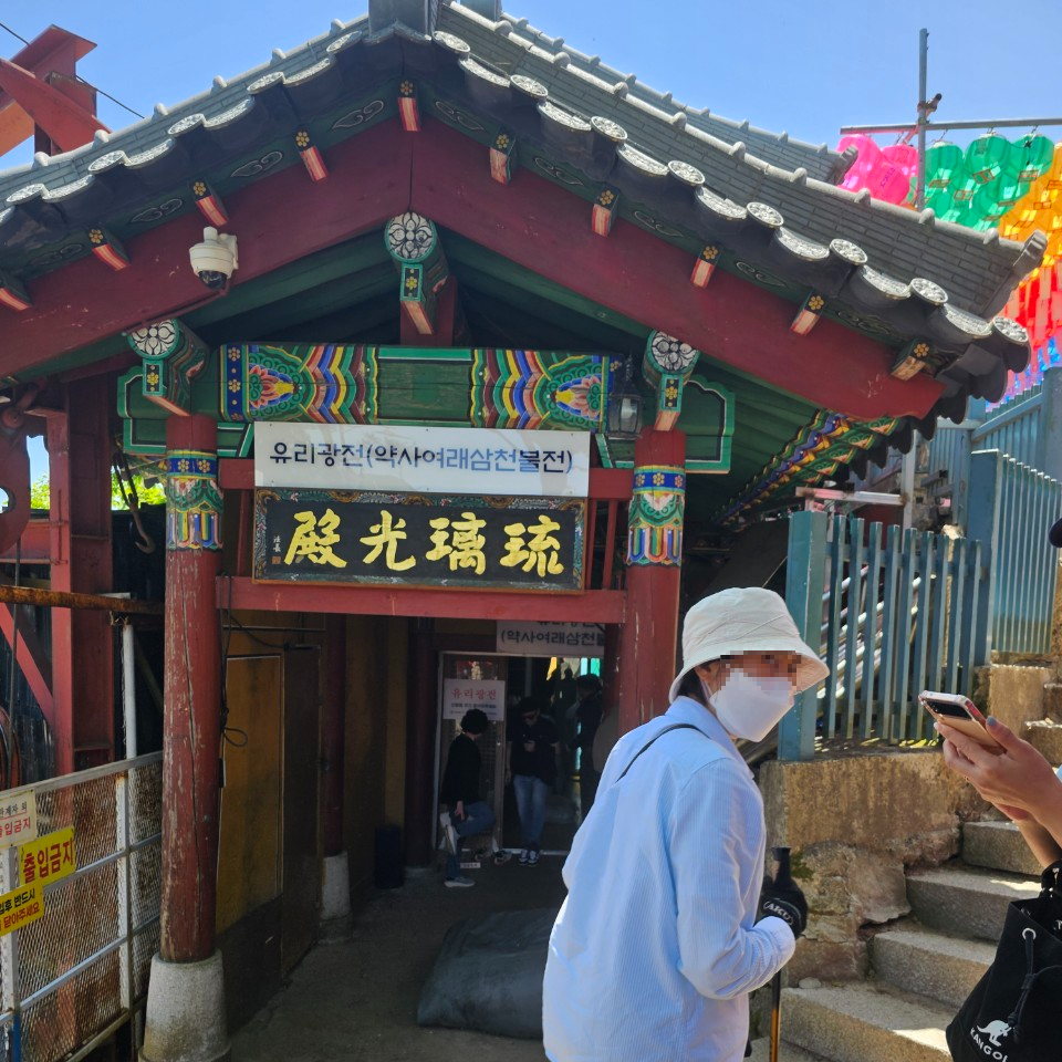 갓바위 종점에서 관봉석조여래좌상까지 900m 남짓 계단을 오르다 보면 대웅전이 나오고 더 오르면 갓바위 부처님 형상을 본딴 약사여래가 모셔진 유리광전이 나온다.