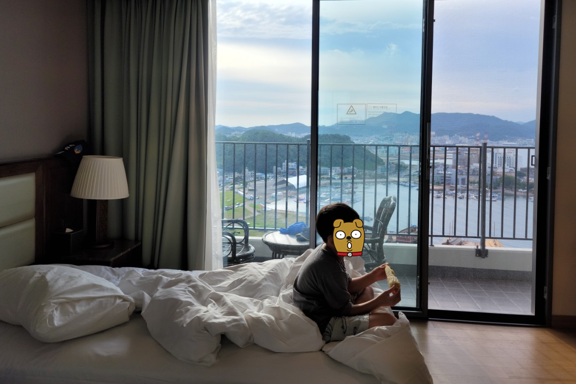 통영 스탠포드 호텔은 콘도형 객실 외에도 호텔형 객실로 슈페리어, 디럭스, 세미스위트 등이 있는데 전 객실 바다 전망이 가능해서 일출과 일몰 감상에 최적이라 한다. 더더욱 우리가 온 시점이 비수기라 그런지 조식과 실내수영장 포함한 저렴한 가격대로 예약했는데, 바다 조망이 좋은 고층까지 배정받았다.