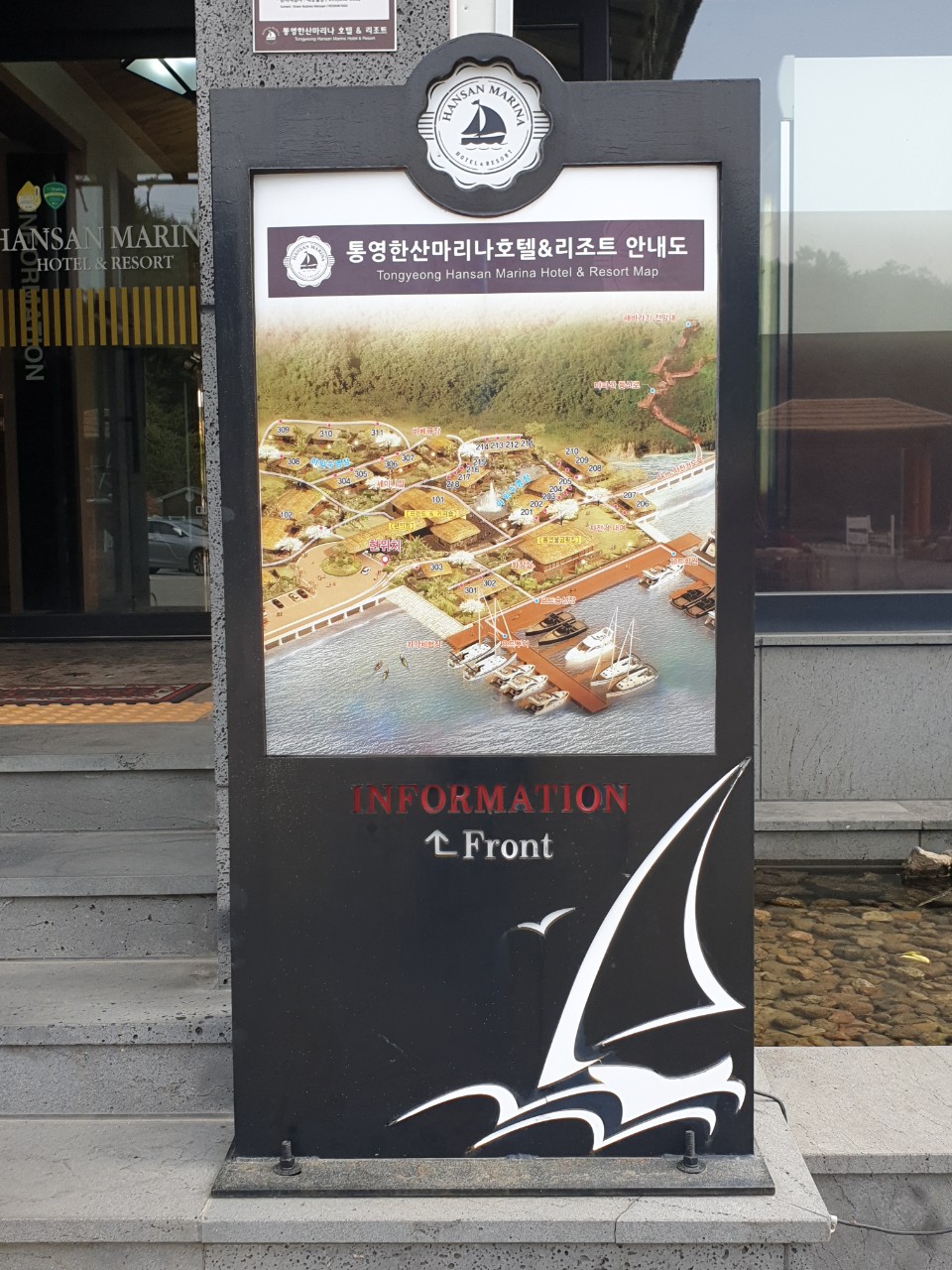 한산 마리나 호텔 앤 리조트는 한려수도해상국립공원에 도보로 닿을 수 있는 거리에 해안선을 따라 자리해 있고, 바로 옆에 페리 및 요트 선착장이 있으며, 해산물 레스토랑 불곰횟집, 도남식당 등이 있다.